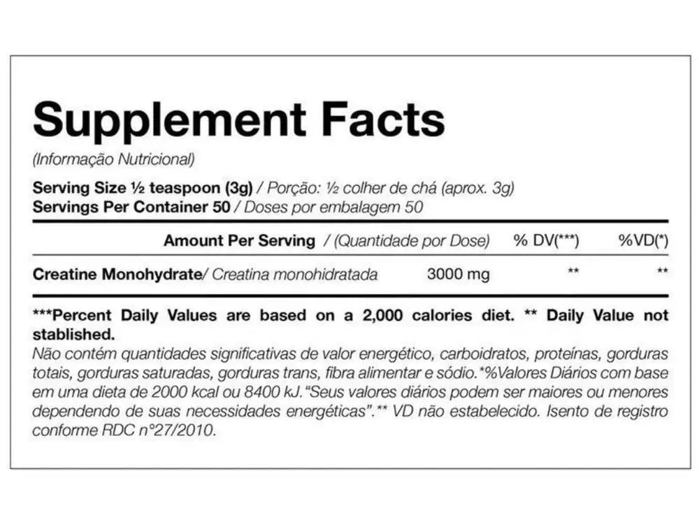 Nutritional Information: 1/2 teaspoon serving-Creatine monohydrate: 3000mg-Does not contain significant amounts of energy value, carbohydrates, proteins, total fats, saturated fats, trans fats, dietary fiber and sodium-* % Daily Values based on and
