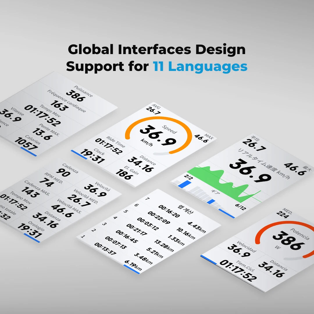 Define your own cycling styles with customized data pages.The CC600 supports various display formats including numerical charts, circular dials, line graphs, and bar charts.